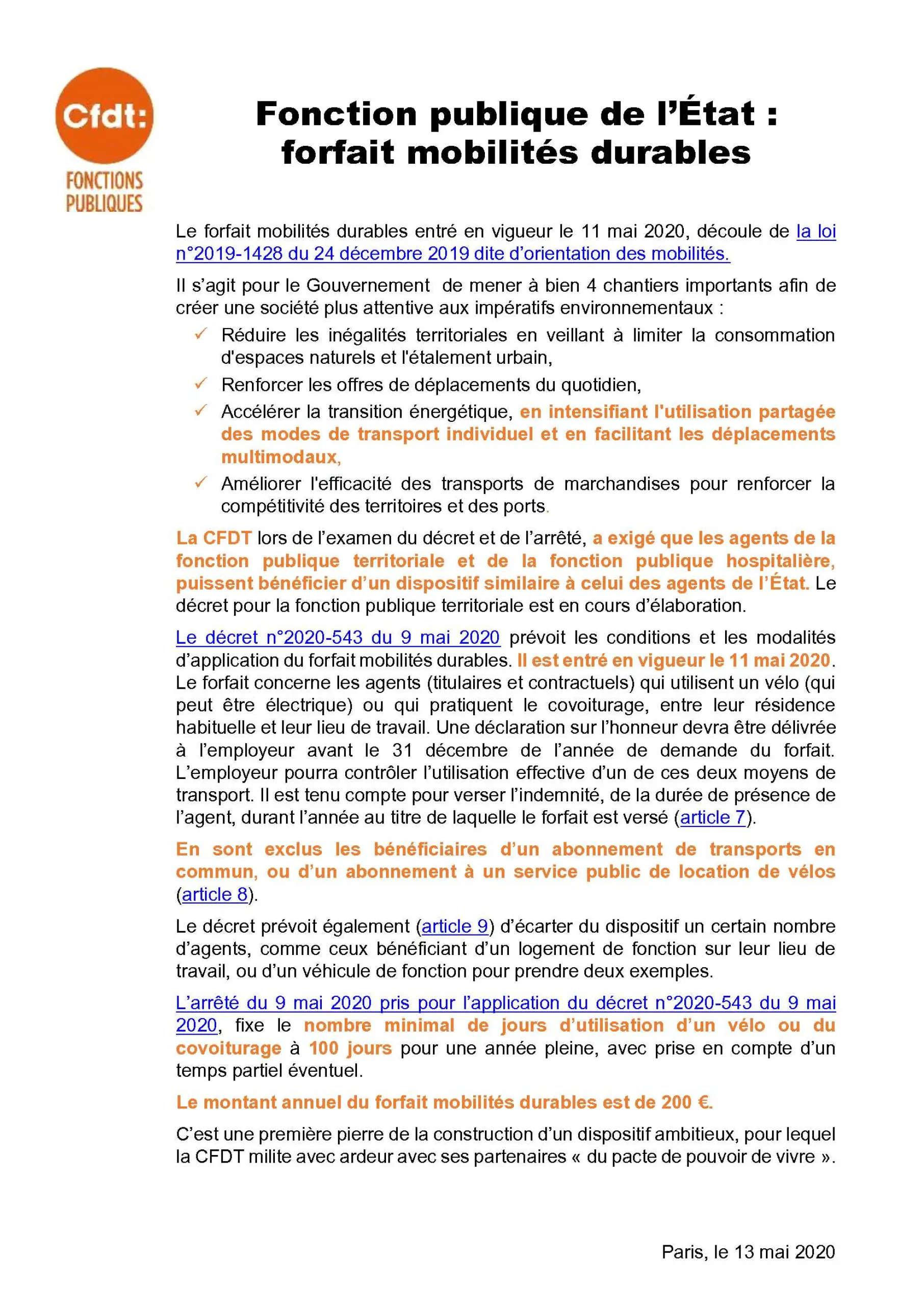 Le décret n°2020-543 du 9 mai 2020, et l’arrêté du 9 mai 2020 pris pour l’application de ce décre,t ont mis en place le forfait mobilités durables. Les agent.es de l’État vont bénéficier de ce forfait mobilités durables, à compter du 11 mai 2020, s’ils utilisent le vélo ou le covoiturage pour se rendre de leur résidence habituelle à leur lieu de travail.