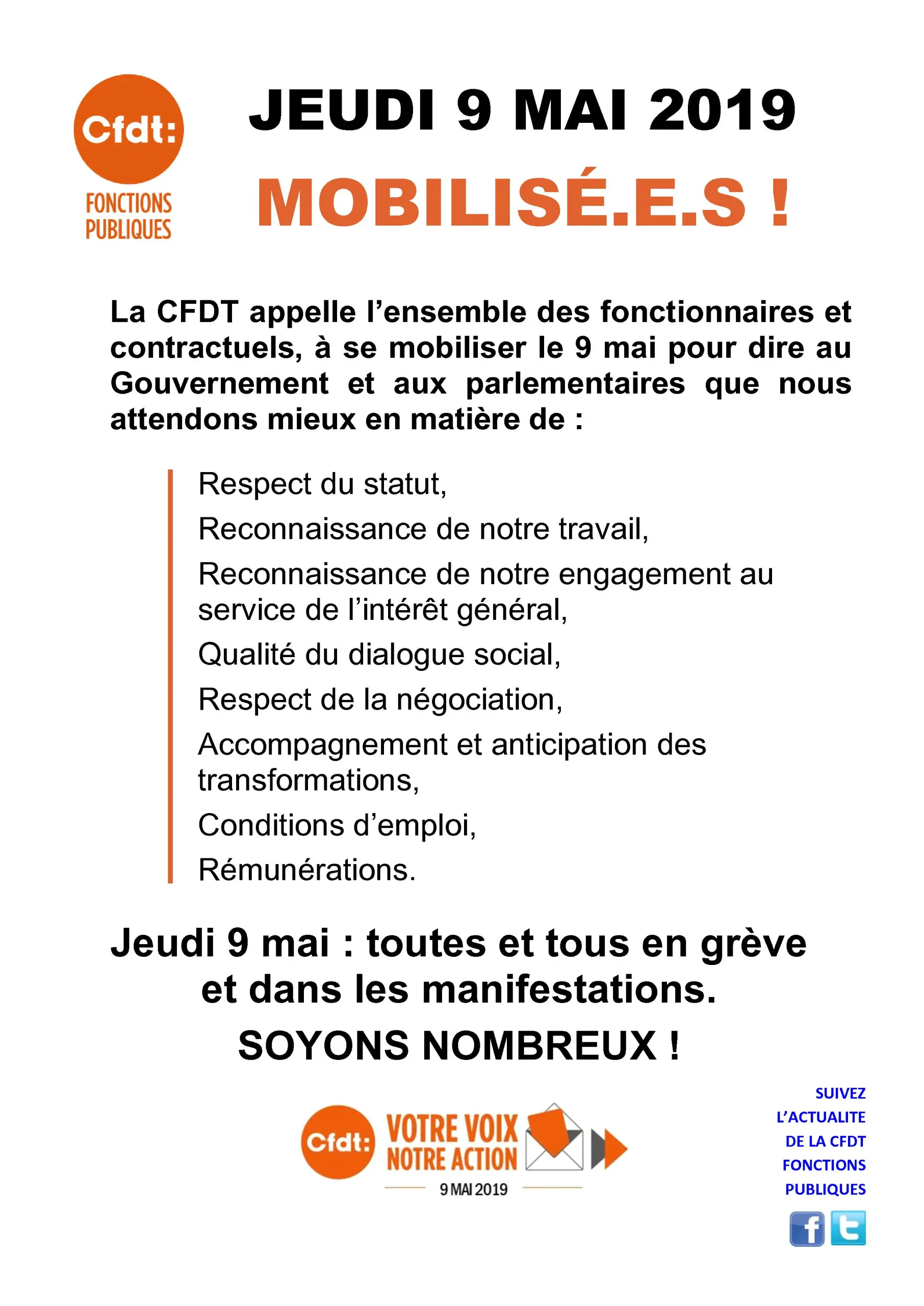 La CFDT appelle l’ensemble des fonctionnaires et contractuels, à se mobiliser le 9 mai pour dire au Gouvernement et aux parlementaires que nous attendons mieux