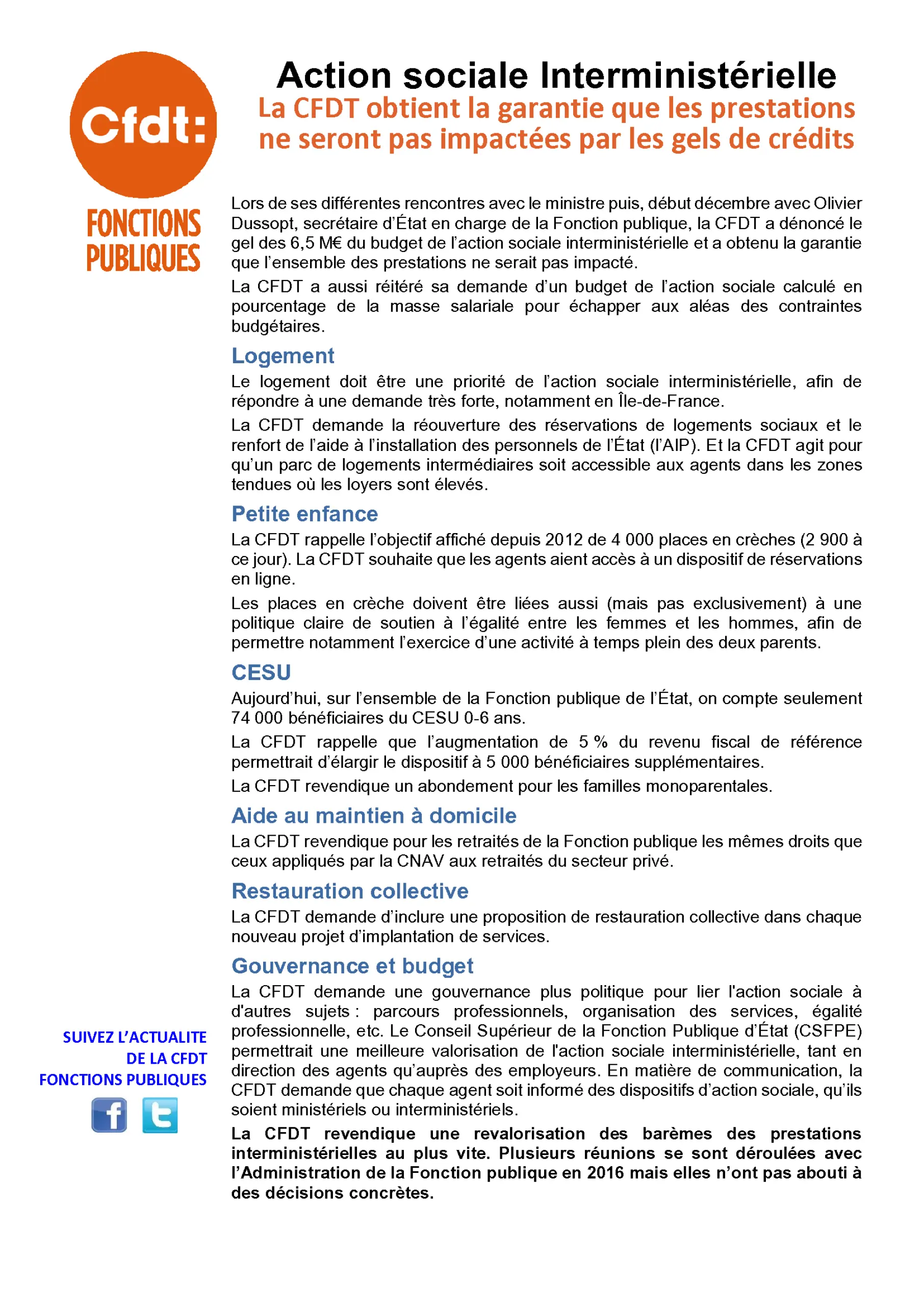 Lors de ses différentes rencontres avec le ministre puis, début décembre avec Olivier Dussopt, secrétaire d’État en charge de la Fonction publique, la CFDT a dénoncé le gel des 6,5 M€ du budget de l’action sociale interministérielle et a obtenu la garantie que l’ensemble des prestations ne serait pas impacté.