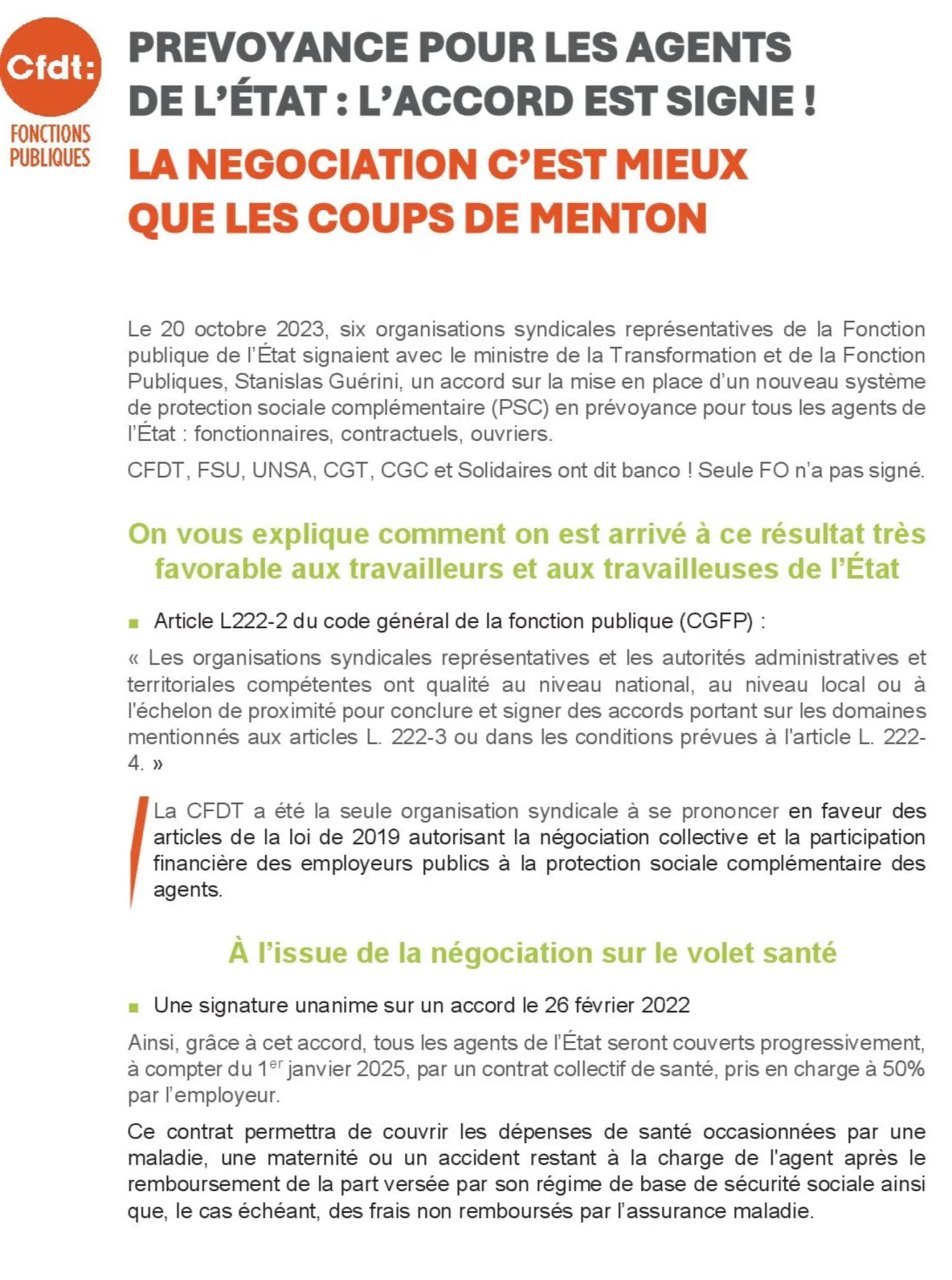 Ce document vous présente les avancées obtenues grâce à l’accord prévoyance signé, le 20 octobre 2023, par six organisations syndicales représentatives de la Fonction publique de l’État. Pour rappel, CFDT, FSU, UNSA, CGT, CGC et Solidaires ont dit banco ! Seule FO n’a pas signé.