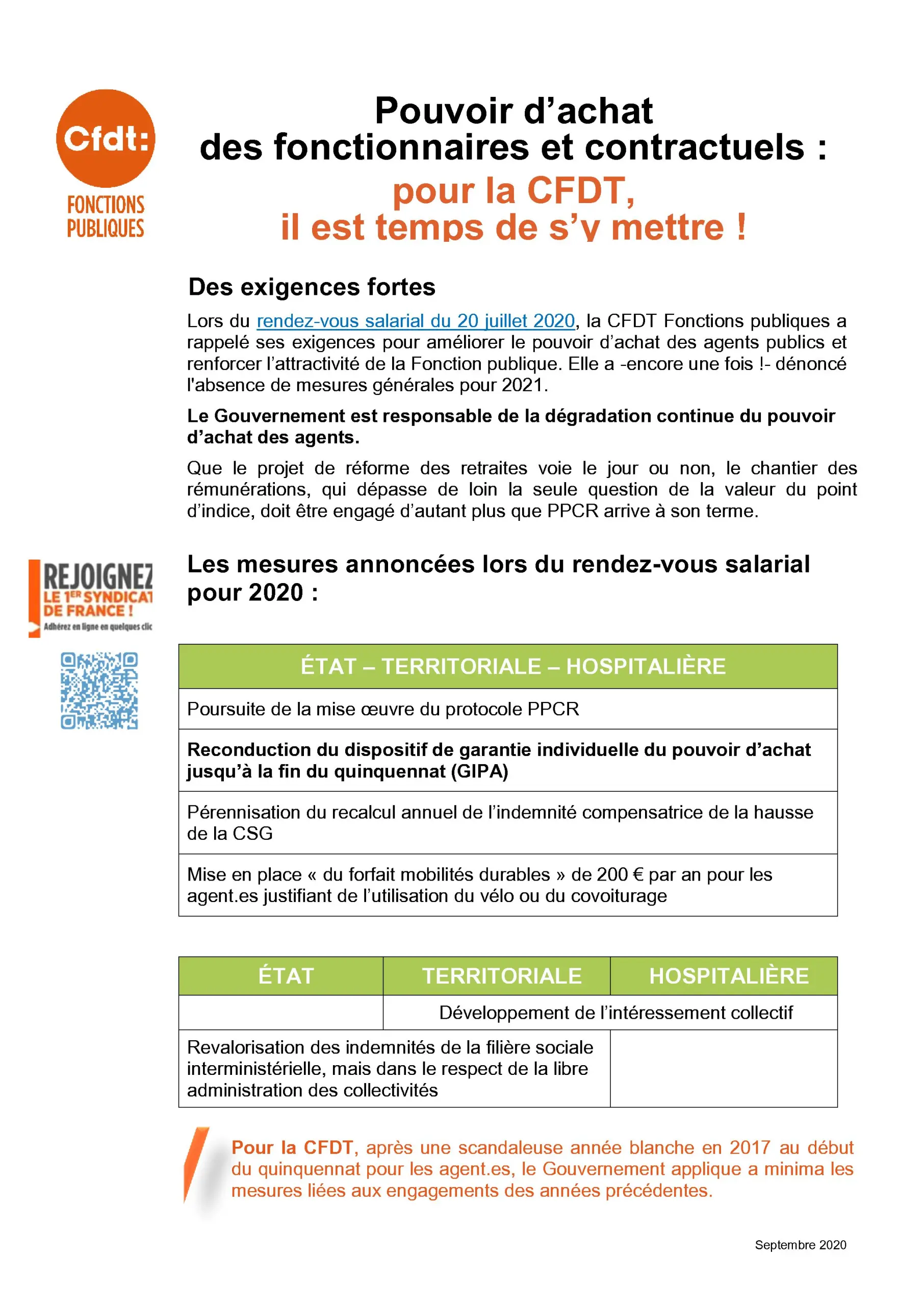 Ce document dresse le bilan des mesures annoncées lors du rendez-vous salarial pour 2020 dans chaque versant, État, Territorial et Hospitalier ainsi que les engagements gouvernementaux pour 2021. Il rapelle les revendications et positions CFDT.