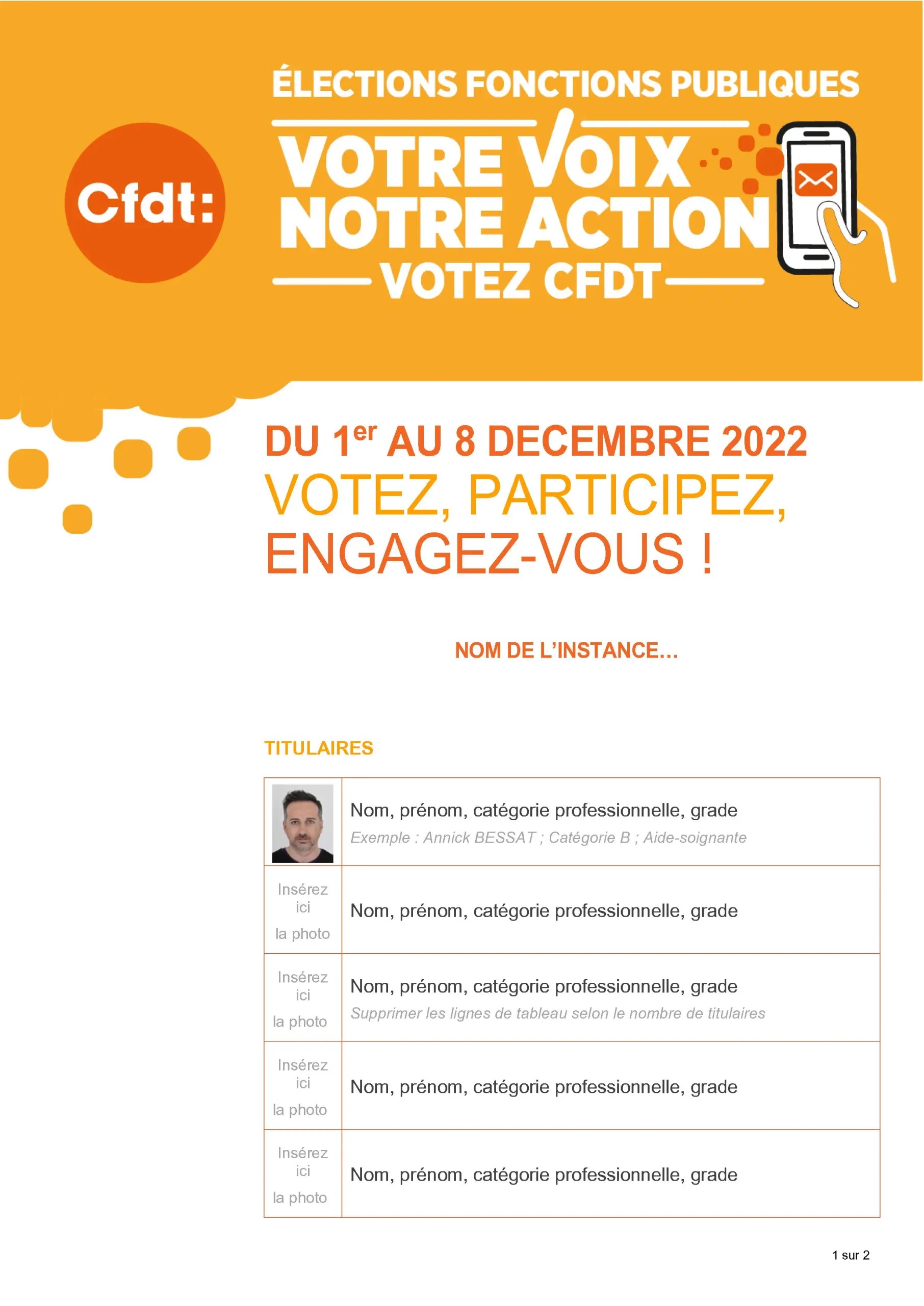 Ces maquettes, en trois couleurs, sont en format word ce qui vous permet de les adapter à vos besoins notamment la date du scrutin suivant les modalités de vote, d’y insérer vos logos (syndicat, QR Code, Facebook...) et coordonnées. Pour intégrer les photos, il suffit de les faire glisser sur l’emplacement dédié. Si vous ne souhaitez qu’une page, il vous suffit de supprimer le saut de page.