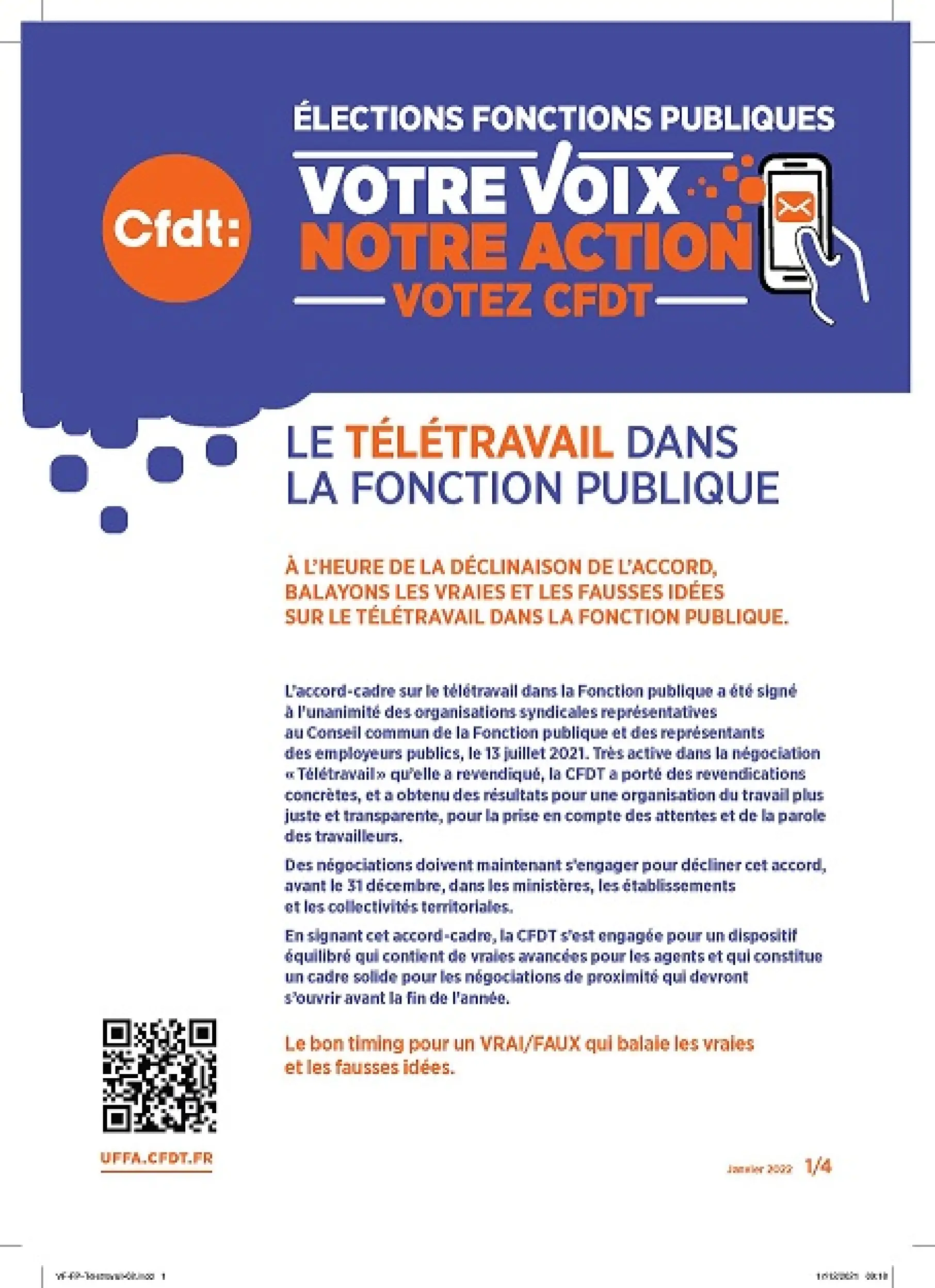 Ce vrai/faux vous aidera à créer une relation privilégiée avec les agents pour expliciter les positions de la CFDT, incarner l’organisation syndicale. Des vidéos seront disponibles au crosspostage sur Facebook à compter du 11 mai pour des diffusions tout au long du mois.